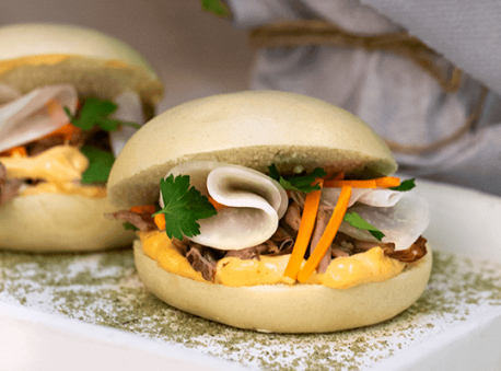 Bao z pikantną szarpaną wieprzowiną, marynowaną kalarepka i kolendrą