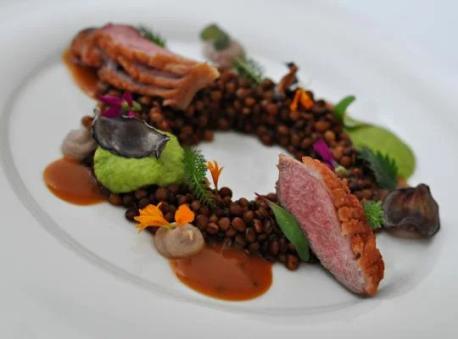 1Pierś z kaczki nacieramy solą , pieprzem oraz olejem z trawą żubrową . Wkładamy do worka vacum i pakujemy próżniowo. Cyrkulator sous-vide nastawiamy na 56 ̊ C . Pierś gotujemy przez 40 minut. Po ugotowaniu nakrajamy skórę w kratkę i obsmażamy na złoty kolor.