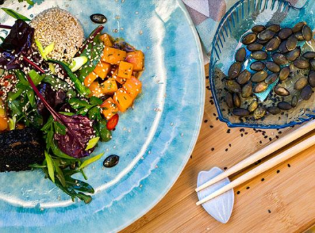 8Przygotowaną dynię oraz tofu podajemy z mix’em sałat okraszonym olejem arachidowym i sokiem z limonki.