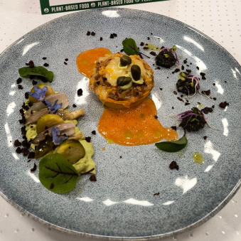 Tarta dyniowa z roślinnym tuńczykiem i boczniakami/ emulsja z avocado/ topenada z pestek dyni i oliwek/ pianka pomidorowa/ oliwa pietruszkowa/ crunch z roślinnego mięsa mielonego/ duszone warzywa
